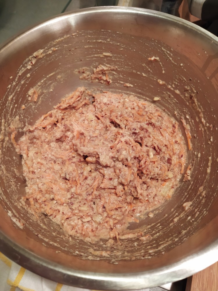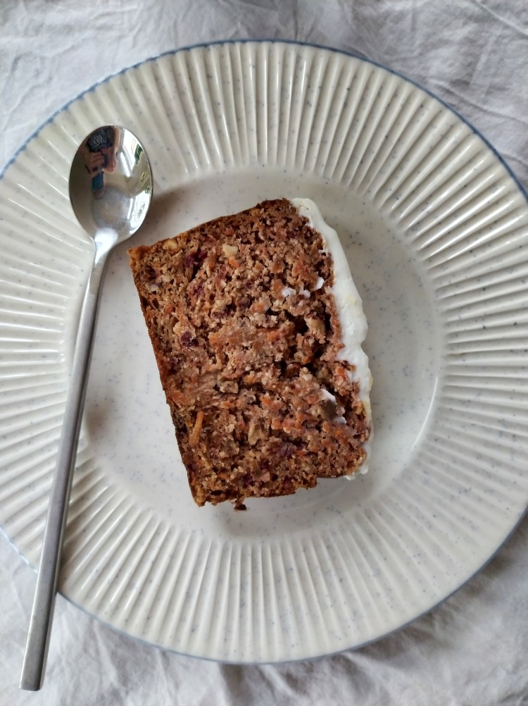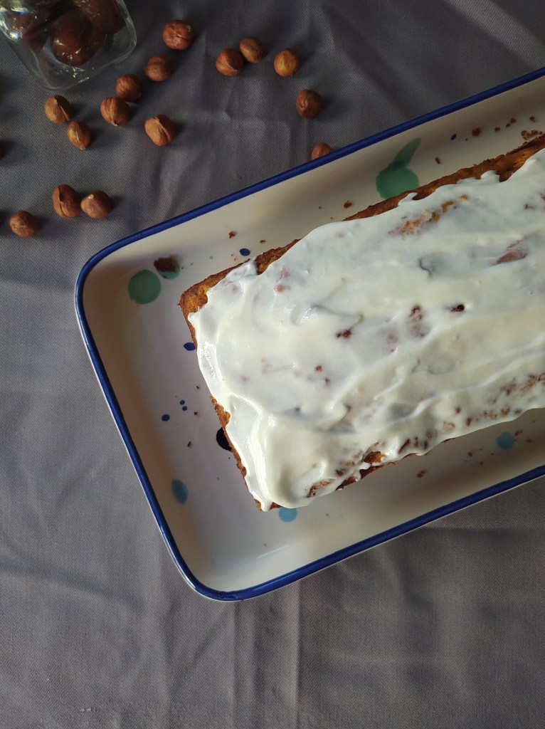 | 3 eggs 200g carrots 150g apple compote 100g gluten free or whole flour 80g almond powder 40g crushed hazelnuts 20g coconut oil 50g dates or prunes 30g agave syrup (incl. 10g for the topping) 200g skyr yogurt 1 ts bicarbonate Cinnamon (optional) | Cake 1. Preheat oven to 180°C/360°F. 2. Melt the coconut oil in a microwave. 3. Mix the eggs, the compote, the syrup and the coconut oil (and the cinnamon). 4. Added the mixed dates (or prunes). 5 . Add the flour, the almond powder, the hazelnuts, the carrots and the bicarbonate. 6. Butter and flour a baking pan (round or a loaf tin). 7. Place the mixture into the pan. 8. Bake in oven for 45 minutes. 9. Let it cool down. Topping 1. Mix the yogurt and the syrup 2. Cover the top of the cake and let it in the fridge for one hour at least. |