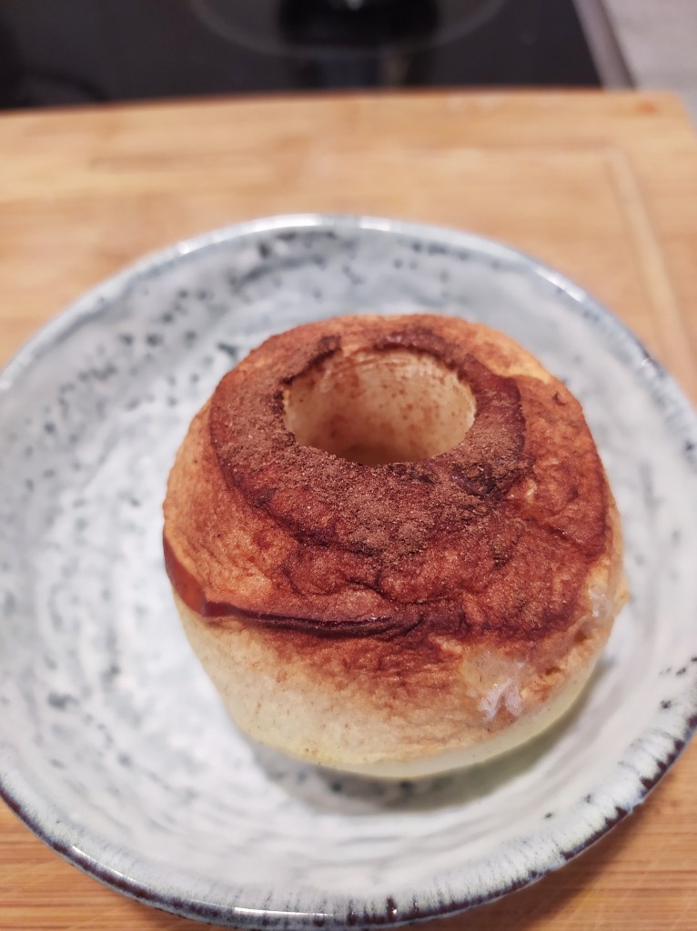 | Pour 2 personnes 2 pommes 2 carrés de chocolat noir 85% cannelle (optionnel) | 1. Éplucher et étrognonner les 2 pommes. 2. Placer dans un plat allant au four avec un petit fond d’eau et saupoudrez de cannelle. 3. Enfournez 40 min à 200°C. 4. En fin de cuisson, ajouter un carré de chocolat au milieu de chaque pomme. et laisser fondre ou procéder au micro-onde. 5. C’est prêt! |