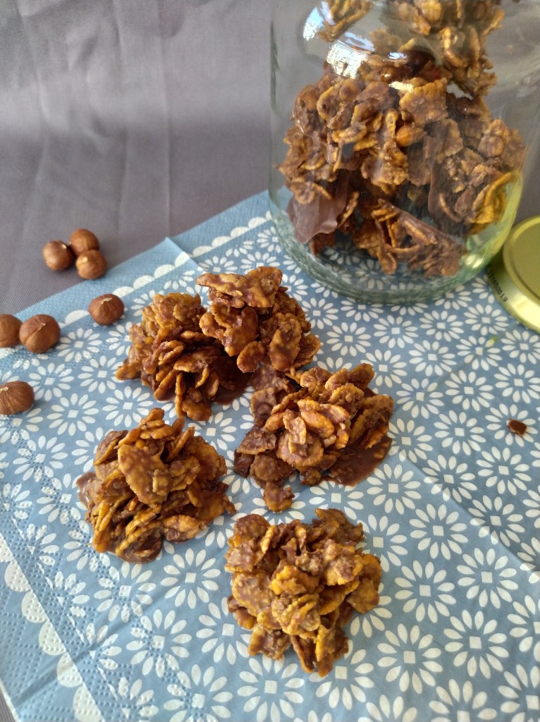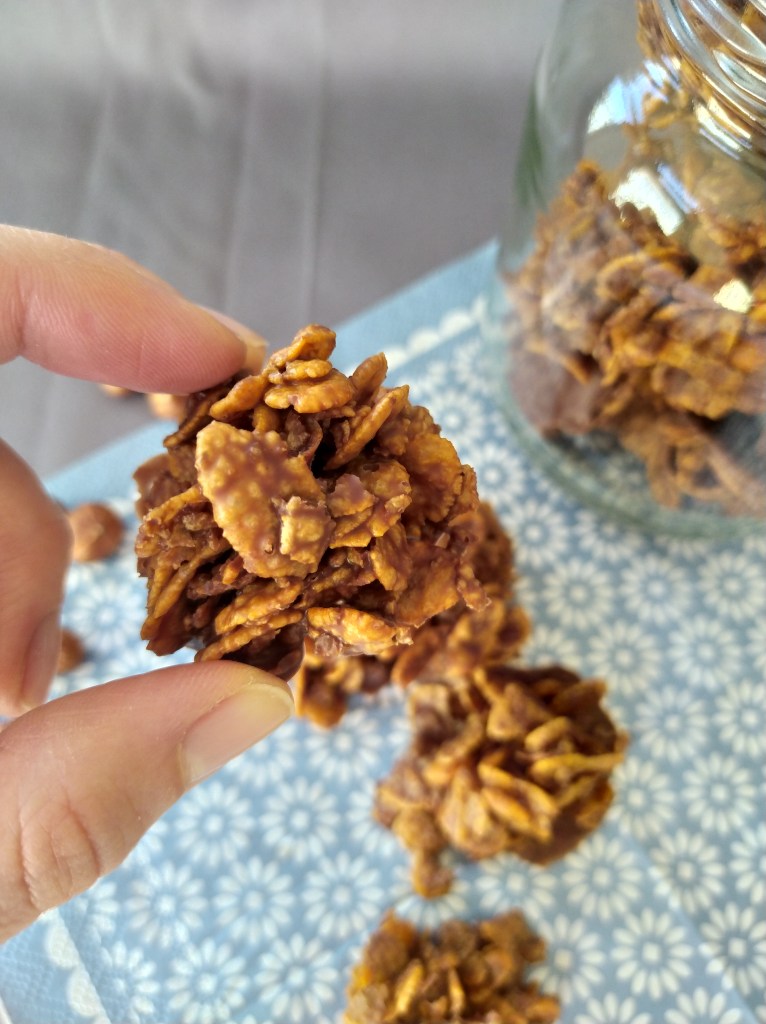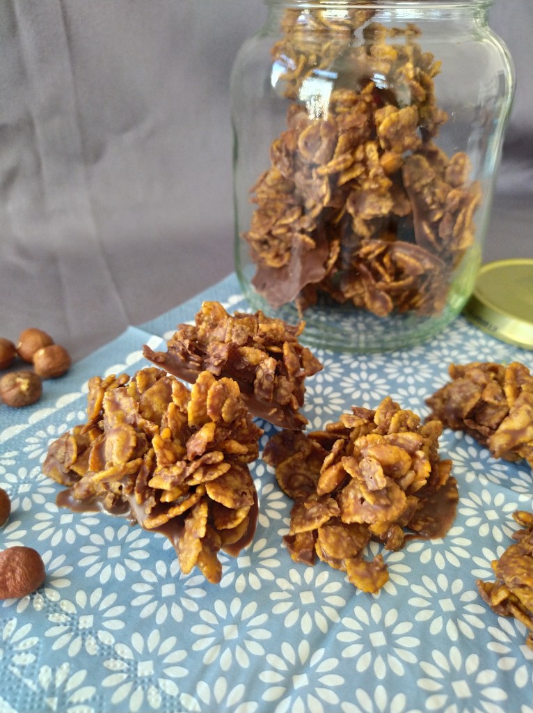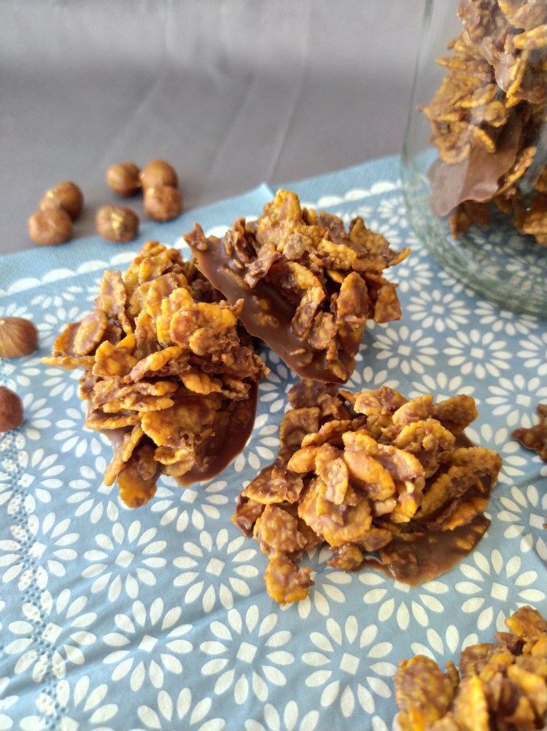 | Pour petites 70 pièces 200g de chocolat dessert 150g de sucre glace 250g de végétaline 375g de cornflakes | 1. Commencer par faire fondre le chocolat avec la végétaline dans une casserole. 2. Dans un gros bol ou un saladier, mélanger les cornflakes et le sucre glace. 3. Verser le chocolat fondu sur les cornflakes et bien mélanger une dizaine de minutes. Le secret est de bien écraser les cornflakes. 4. A l’aide d’une cuillère à soupe, faire des petits tas avec la préparation sur une plaque recouverte de papier aluminium allant au frigo. Laisser durcir plusieurs heures au frigo. 5. Bien conserver au frigo, 4 jours max. |