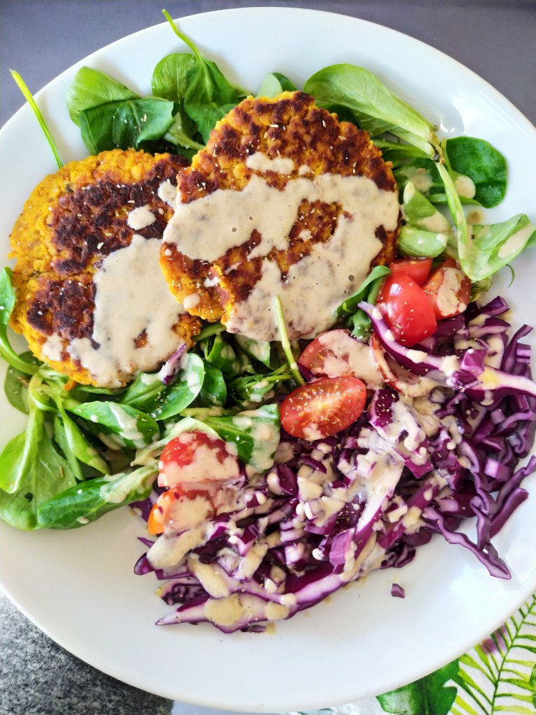 Il s’agit de galettes de lentilles corail accommodées des quelques aromates, d’une sauce à la purée de sésame et d’une grande assiette de crudités.