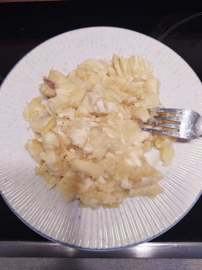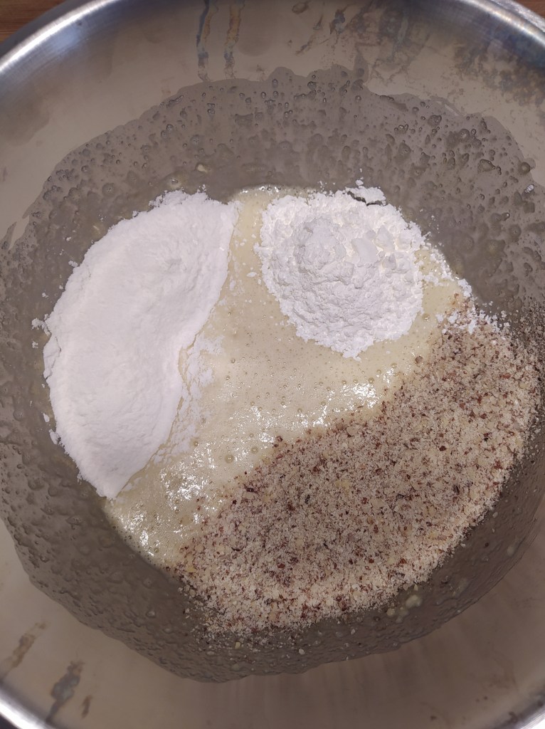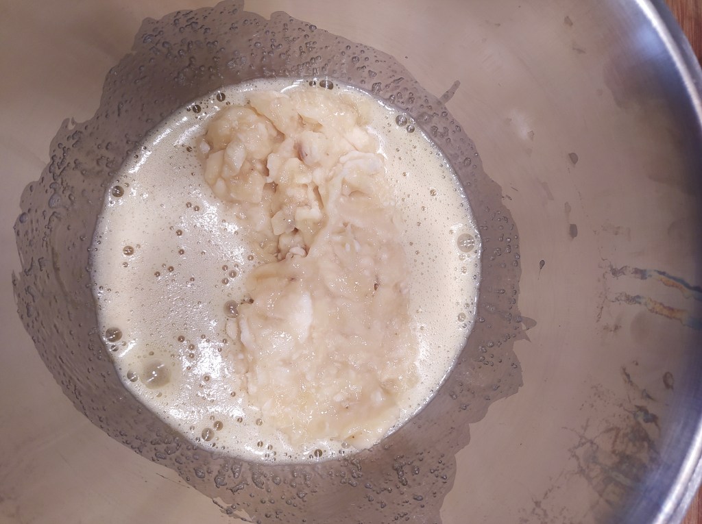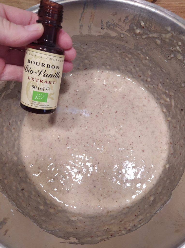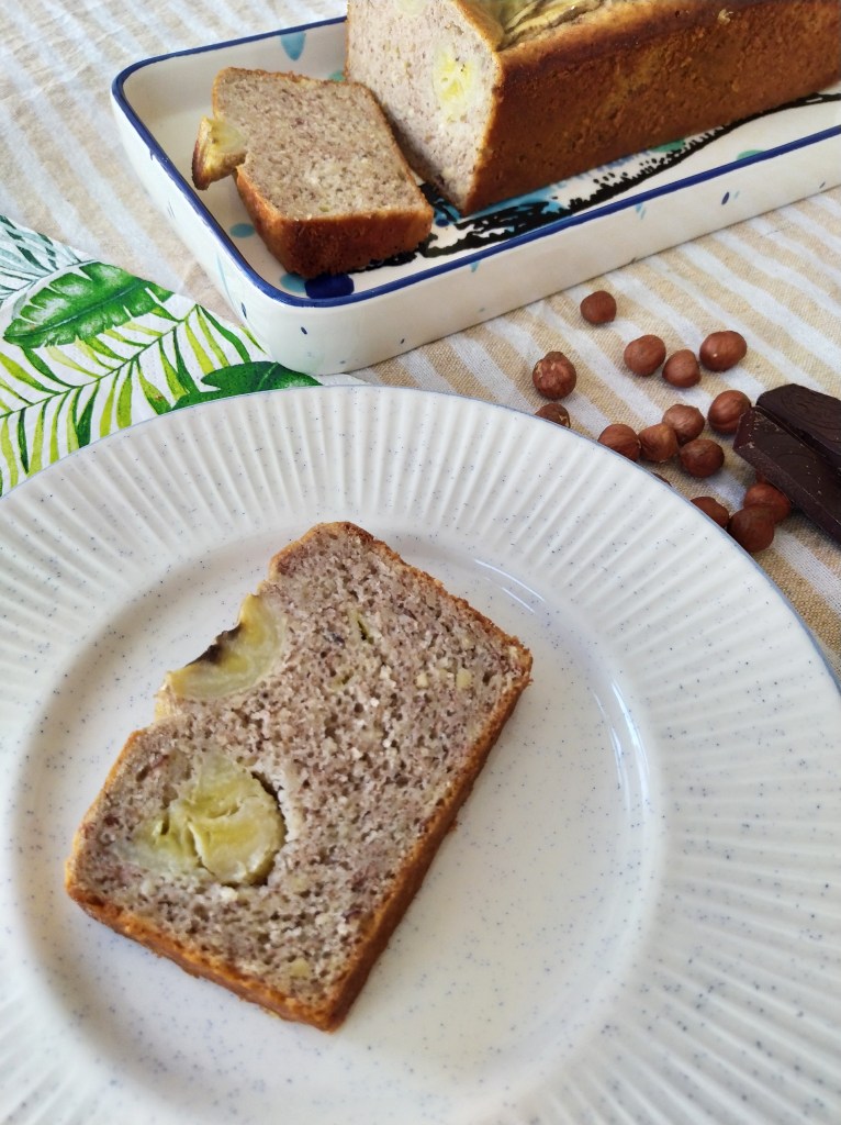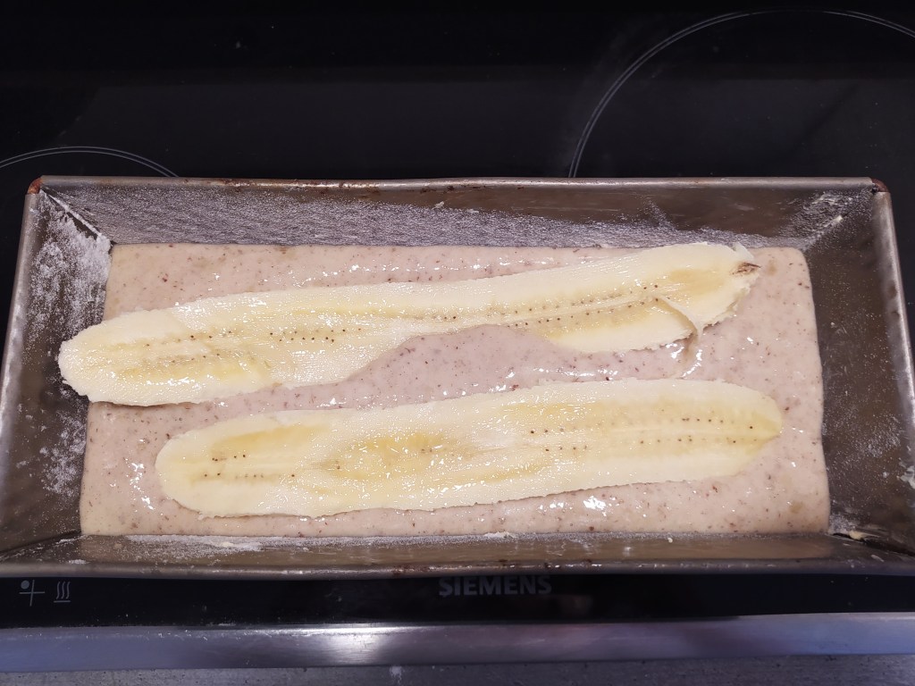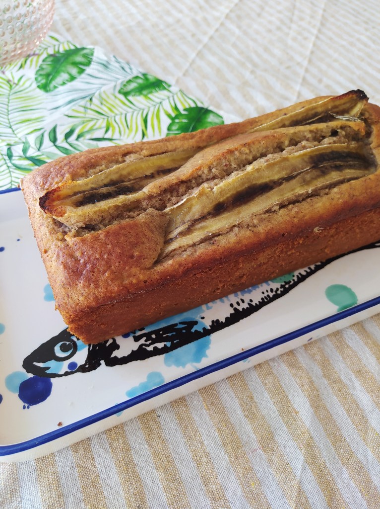 | 3 ripe bananas 2 eggs 10 cl plant milk 50g almond powder 70g rice flour 30g cornstarch 60g brown sugar 2 tbsp liquid vanilla 1 tsp cinnamon Salt | 1. Smash 2 bananas. Whisk the eggs with the sugar until the mixture turns white and mix with the smashed bananas. 2. In a bowl mix almond powder, rice flour, starch, baking powder, cinnamon and 2 pinches of salt and add to the preparation. 3. Add the liquid vanilla and the milk. 4. Pour into a cake pan and use the last banana for decoration. Bake 35-40min at 180 ° C. |