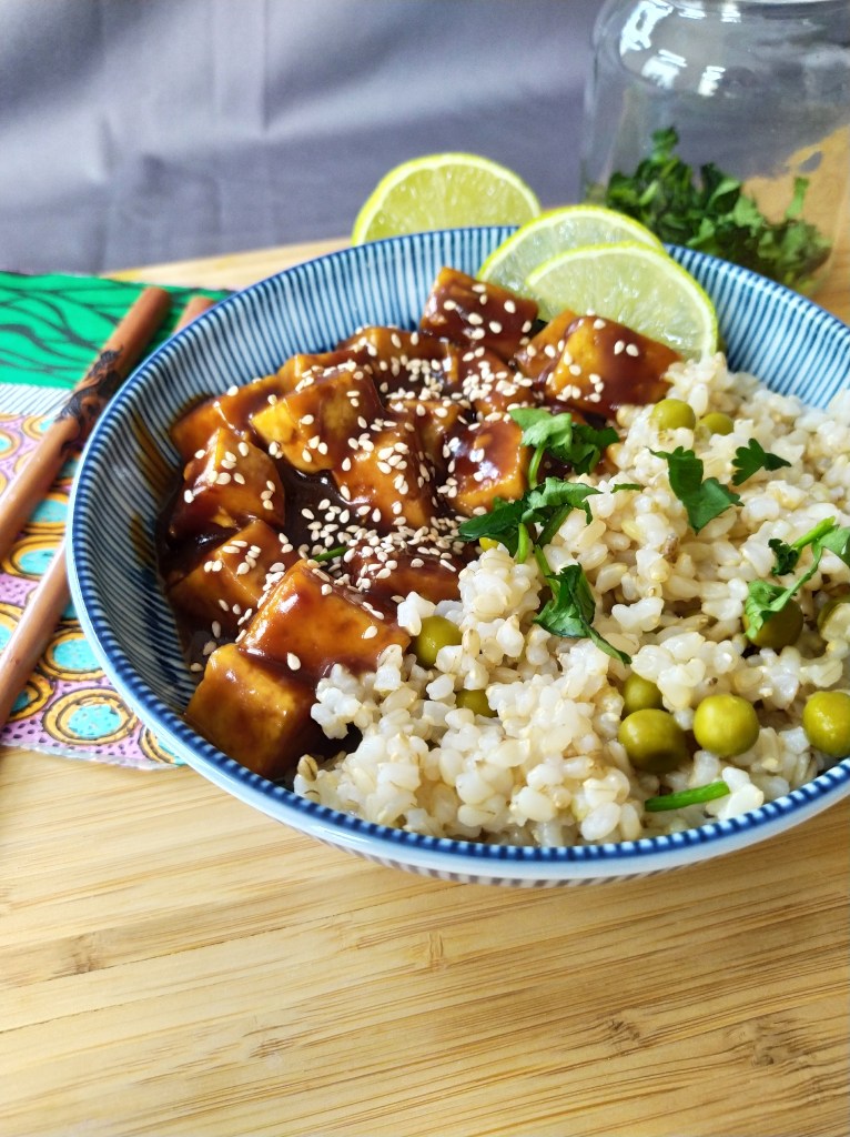 | Pour 2 personnes 200g de tofu nature coupé en dés 1 gousse d’ail ciselé 50ml de sauce soja 2 càs de miel (ou sirop d’agave ou sucre roux pour une version vegan) 1 càs de vinaigre de cidre 1 càc de gingembre en poudre ( ou frais) 1 càs de fécule de maïs 5 càs d’eau 1 càc de purée de sésame (tahin) 1 càs de graines de sésame | 1. Mélanger tous les ingrédients dans un bol jusqu’à obtenir un texture homogène. 2. Chauffer une cuillère à soupe d’huile d’olive dans une poêle et faire dorer le tofu à feu vif. 3. A feu doux, verser sur le tofu en remuant. Le mélange va s’épaissir presque instantanément. 4. Mélanger 3 minutes jusqu’à la caramélisation puis servir avec di riz, des légumes vapeurs et un zeste de citron. |