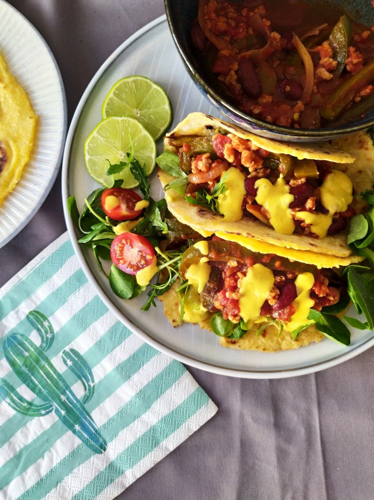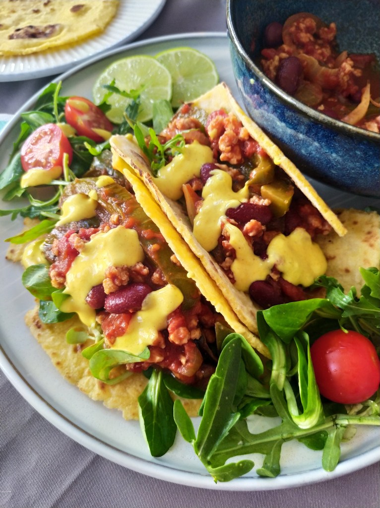 Vegan tacos with textured vegetable protein & « cheddar » sauce