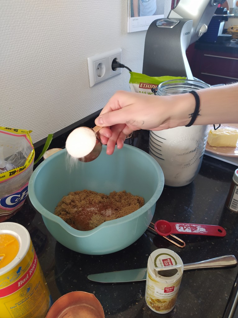 5. To prepare the filling, while the dough is rising, in a bowl, combine the brown sugar, cinnamon, cardamom, butter and salt.