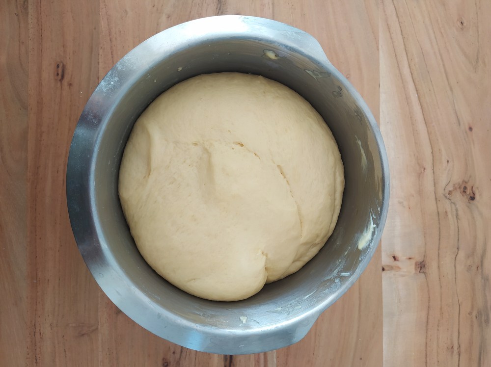 3. Augmentez légèrement la vitesse et ajoutez le beurre en morceaux jusqu’à ce qu’il soit complètement incorporé – à ce stade, la pâte sera très humide. Continuez à mélanger pendant 10 minutes supplémentaires. Si la pâte est encore humide, ajoutez jusqu’à 30 g de farine en l’incorporant cuillère par cuillère. 4. Une fois terminée, la pâte doit être très douce et délicate mais pas trop collante à manipuler. Transférer la pâte dans un moule assez grand pour laisser la pâte doubler de volume, jusqu’à 2 heures à température ambiante. Pour accélérer les choses, vous pouvez placer la pâte à l’intérieur d’un four éteint mais préchauffer à 30 ° C.