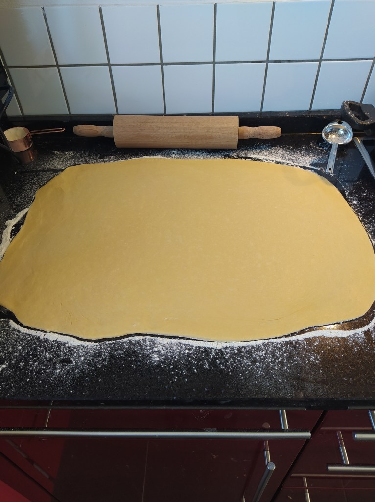 7. Place the dough on a lightly floured work surface. Roll out the dough in the shape of a rectangle (suggested size 48 x 36 cm). With clean hands, spread the filling evenly over the dough (see pictures below). Cut equal strips and roll them to form the rolls and place them in the reserved cake pans.