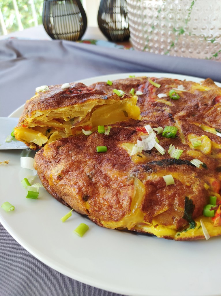 Je vis en Allemagne et sur mon chemin, j’ai rencontré quelques expatriés espagnols qui ont TOUS cuisiné au moins une fois la tortilla. J’ai bien observé, j’ai demandé quelques conseils et voici ma recette de la tortilla avec des poivrons. Le plus compliqué c’est de retourner la galette mais le coup de main se prends vite !