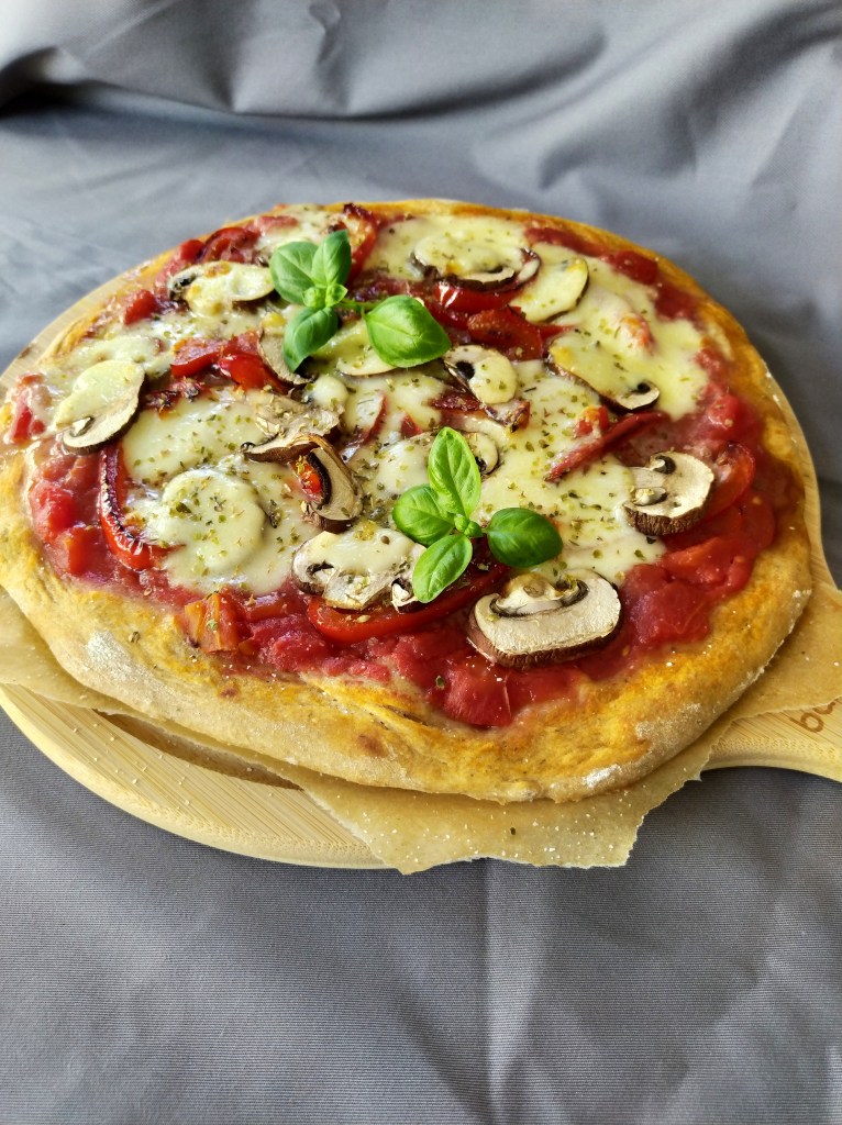 Pizza dough 100g white flour 100g whole (or white flour) 30g olive oil 8g fresh baker’s yeast (or 5g dry yeast) 140 to 170ml of water 8g salt Herbs of Provence Garnish 1 can of crushed tomatoes 1/2 red peppers 4 or 5 mushrooms 1 tbsp agave syrup Mozzarella Oregano Salt Basil leaves | Preparation of the dough: 1.In a bowl, dilute the yeast in 140ml of warm water. 2.In the bowl of your robot or in a bowl mix the flours, salt, Provence herbs and olive oil. Pour the diluted yeast and knead the dough for ten minutes. If it is too dry add a little water little by little. The dough should be smooth and elastic. Form a ball and cover it with a damp cloth. Let it rise for 2 hours near a heat source (oven, radiator …). Meanwhile, prepare the garnish: 1.Cut the peppers into strips. Brown the peppers in a pan with a drizzle of olive oil. Halfway through cooking, add a dash of agave syrup and 2 tablespoons of water and leave to cook for a few minutes. 3.Cut the mushrooms into strips and the mozzarella into pieces. Reserve. Compose the pizza: 1.Preheat the oven to 250 ° C. 2.Degas the pizza dough and spread it on a floured work surface using a roller. Place the dough on a baking sheet lined with parchment paper. Spread a layer of crushed tomatoes and add the peppers, mushrooms and mozzarella. 3.Bake for 15 to 20 minutes. 4.Remove from the oven, sprinkle with oregano, salt lightly and add the basil leaves. It’s ready! |