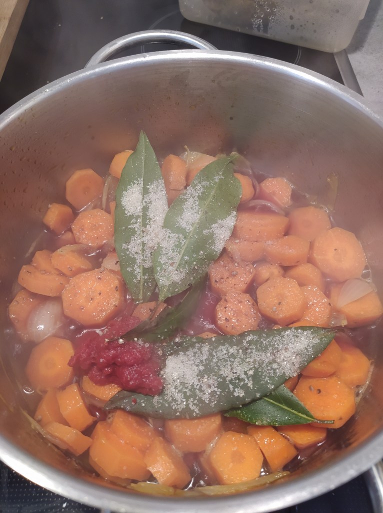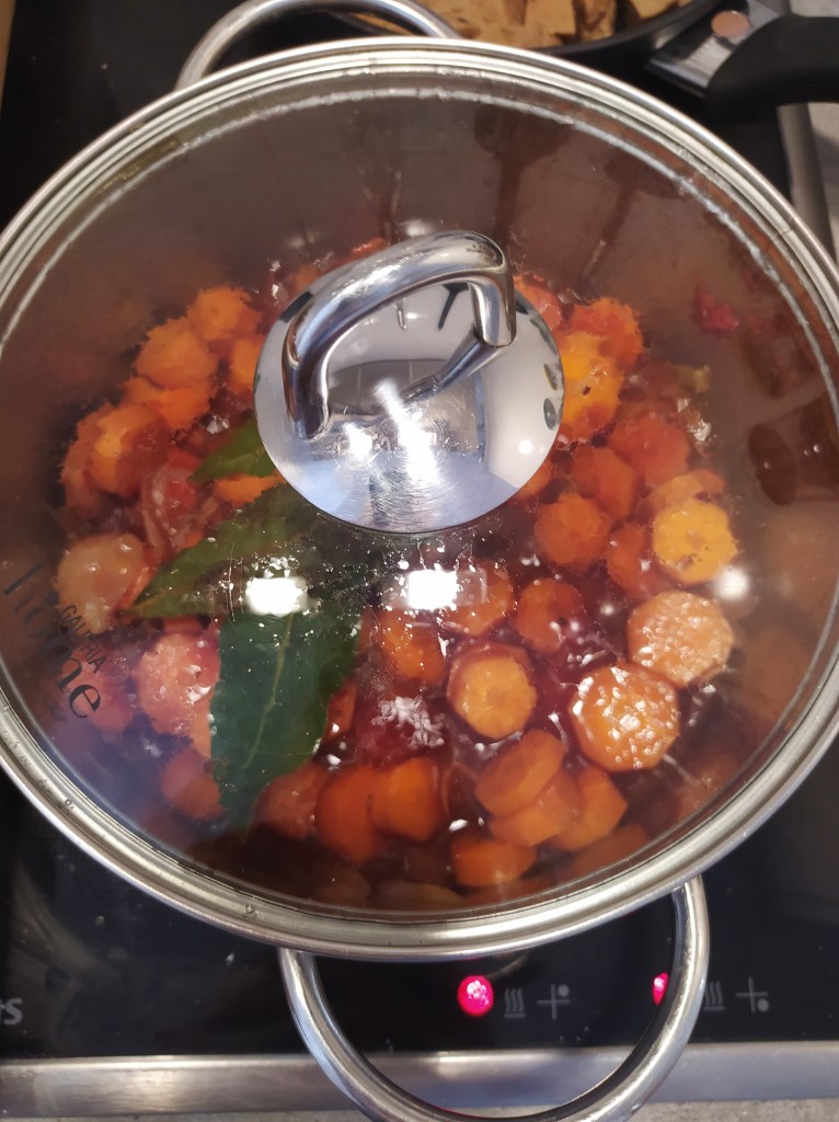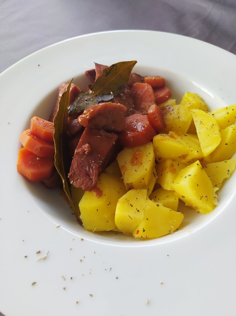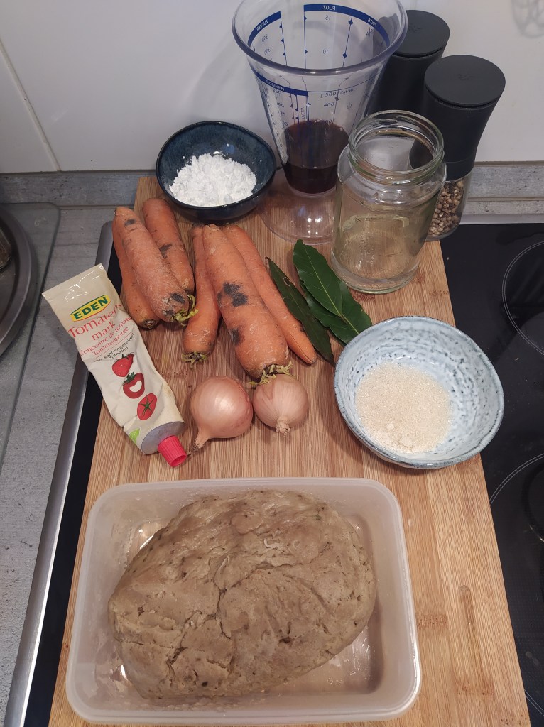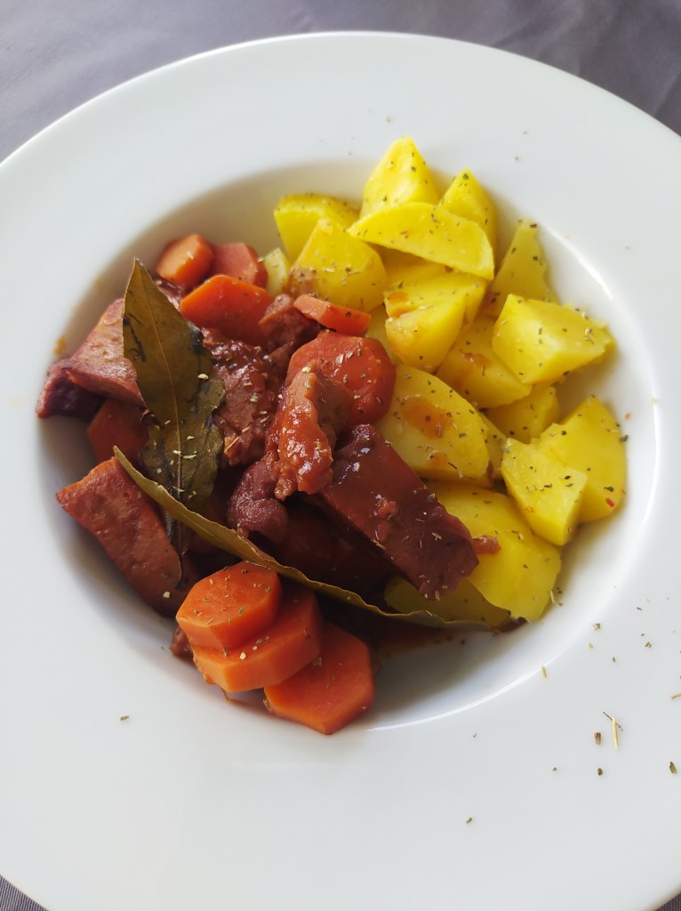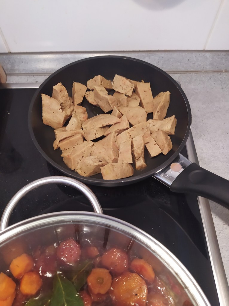 For the seitan: 250 g wheat gluten 50 g flour (the one you want) 30 g nutritional yeast 250 ml of water 250 ml soy sauce 3 tbsp tomato puree 3 tbsp soy sauce 1 tsp paprika 1 tsp garlic powder 1 tsp oregano Accompaniments for 2 people: 4-5 potatoes 5-6 carrots 2 onions bay leaves 75 ml red wine (+ 75ml if necessary) 50 ml of water (+ 50ml if necessary) 1 tbsp sugar 2 tbsp tomato puree 2 tbsp cornstarch Salt and pepper | Preparation of seitan: In a bowl, combine the gluten, flour and nutritional yeast. Then add the spices and mix. Add water, soy sauce and tomato puree. Form a ball, put in a cloth bag like a jam cloth and cook in a saucepan of boiling water for 50 min. Steam cooking for 30 minutes is also possible. Leave to cool then cut into slices and then dice so as to form your pieces of « meat ». Reserve. Preparation of the dish: In a deep saucepan: cook the onions with 2 tbsp olive oil then add the carrots in slices. Cook for 5 minutes, stirring. Then add: wine, water, sugar, bay leaf. Cover the pan and cook for 15 minutes over medium-low heat. In parallel, toast the pieces of seitan in a pan with olive oil. Add the pieces to the pan and continue cooking for 30 minutes over low heat. Watch and mix from time to time. Add water and wine as the sauce evaporates. At the end of cooking, add a little sifted starch to thicken the sauce. Serve with steamed potatoes or tagliatelle. |
