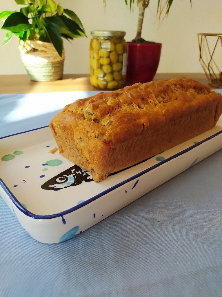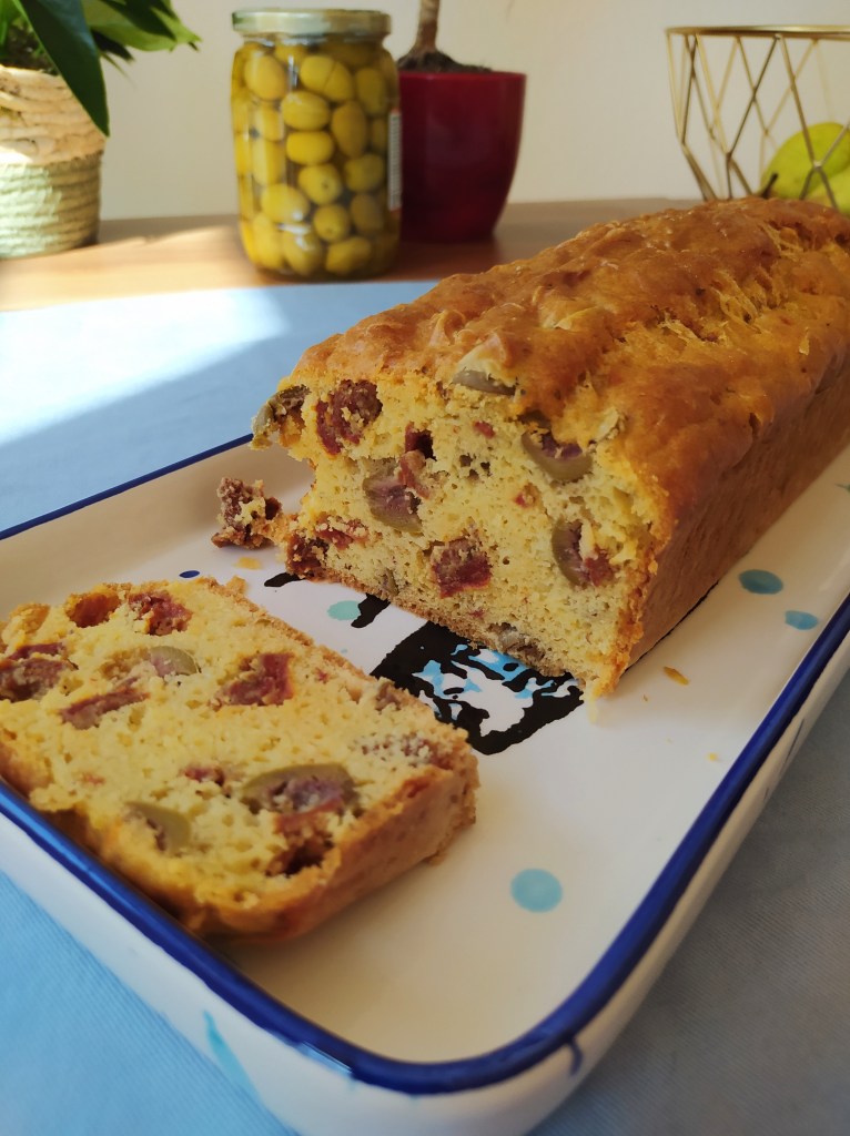 3 eggs 150g flour 10g baking powder 1 tsp baking soda 10cl sunflower oil 12.5cl warm milk (vegetable milk possible) 80g grated gruyère cheese or emmental cheese 120g marinated sundried tomatoes 100g pitted olives 1 pinch of salt 1 pinch of pepper | 1. Preheat the oven to 180 ° C. 2. Cut the olives and the dried tomatoes into pieces. 3. In a bowl, whisk the eggs, flour, baking powder, baking soda, salt and pepper. 4. Gradually add the oil and the previously heated milk (the milk should be lukewarm, not hot). 5. Add the emmental cheese and stir. Put the olives and the dried tomatoes in the dough. Mix everything. 6. Pour into an ungreased baking pan lined with baking paper and bake for 45 minutes. 7. Let cool before tasting. |