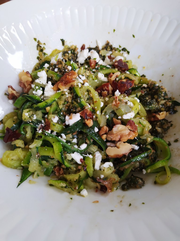 Zucchini spaghetti with vegan pesto, feta & caramelized nuts