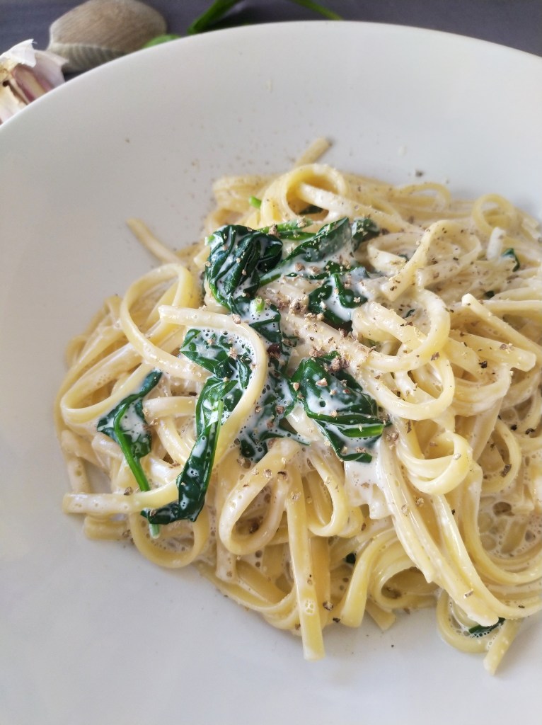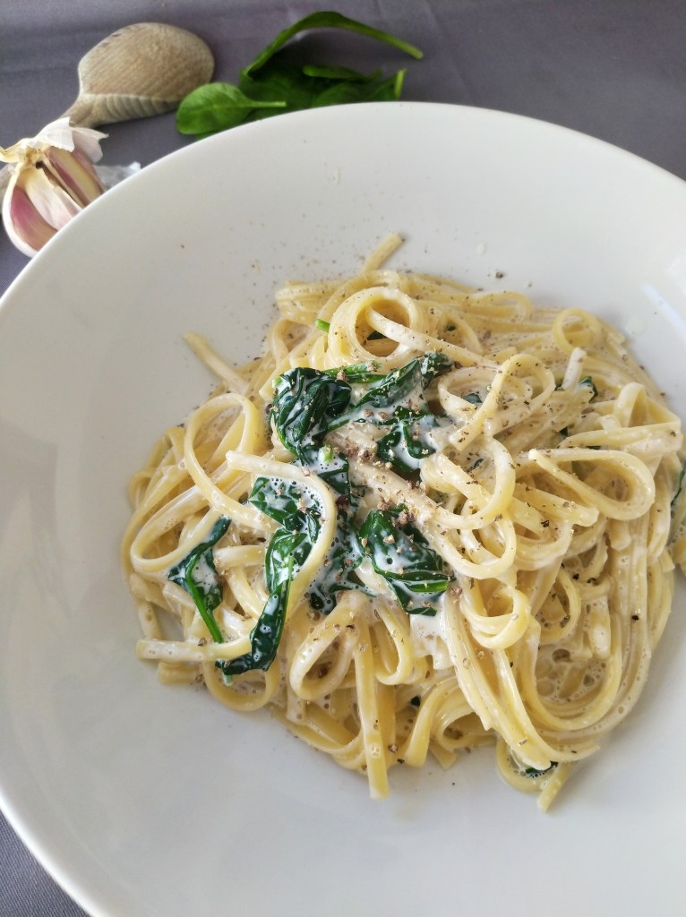 Spinach linguine with a creamy garlic sauce