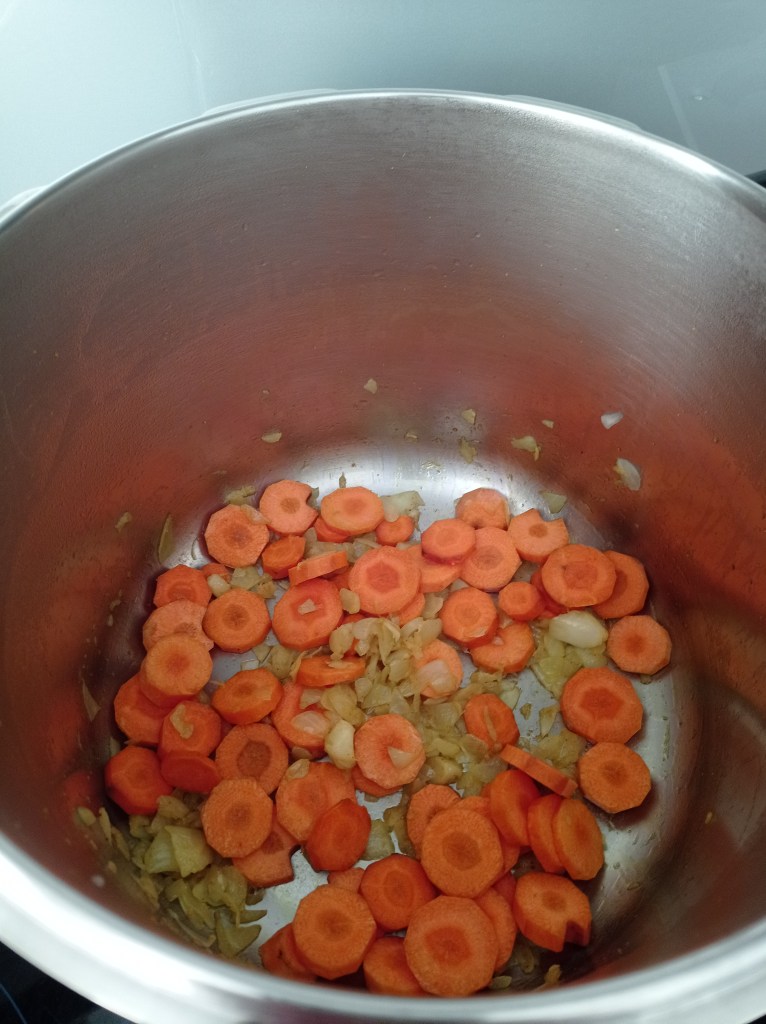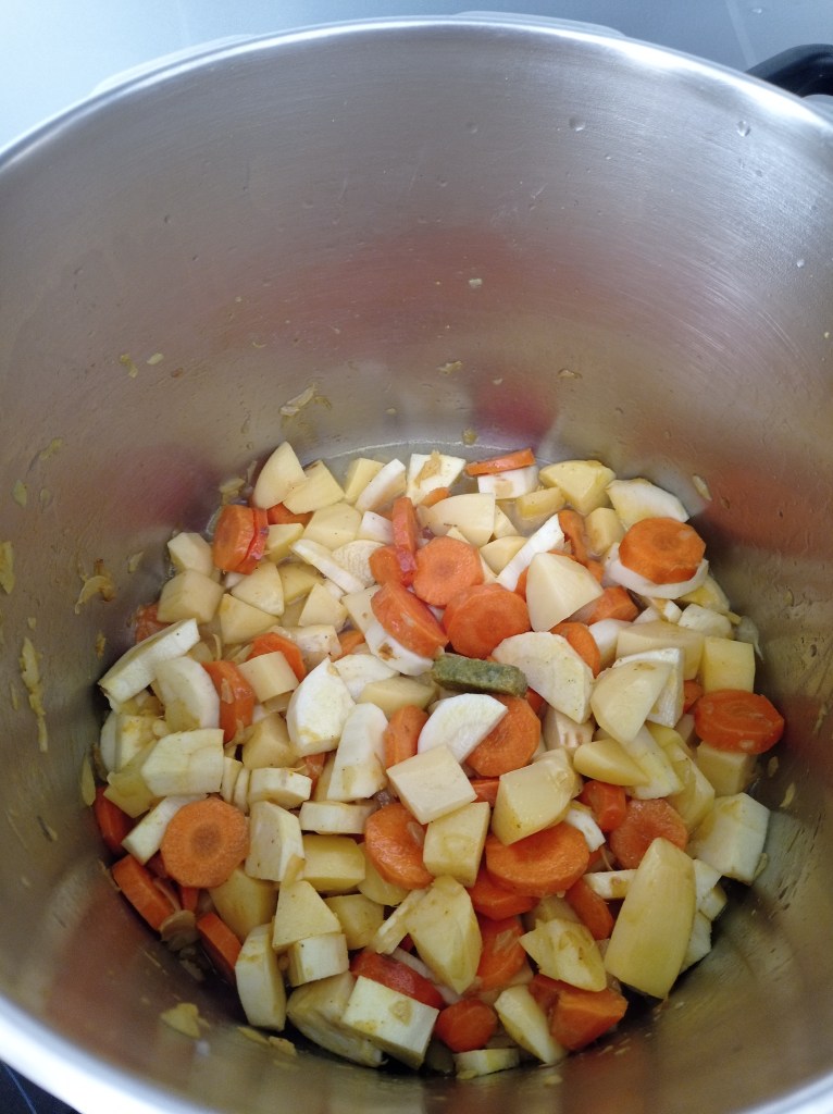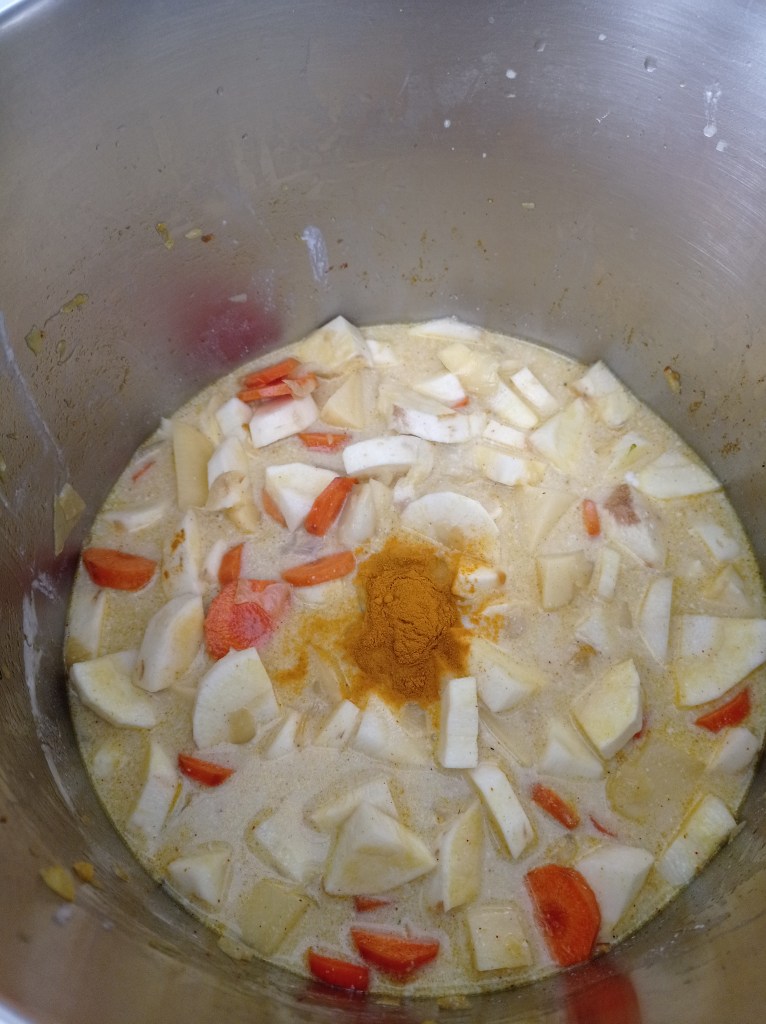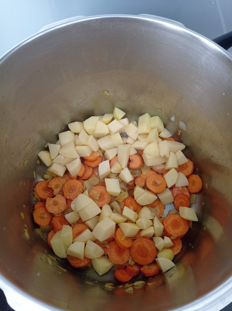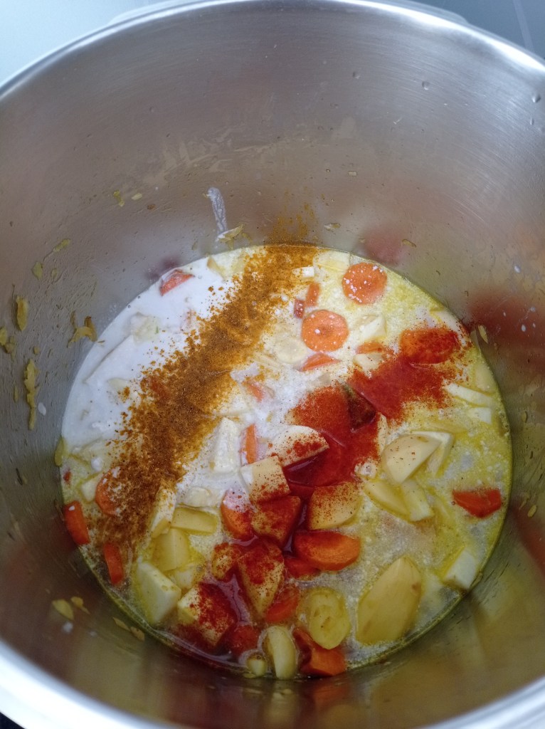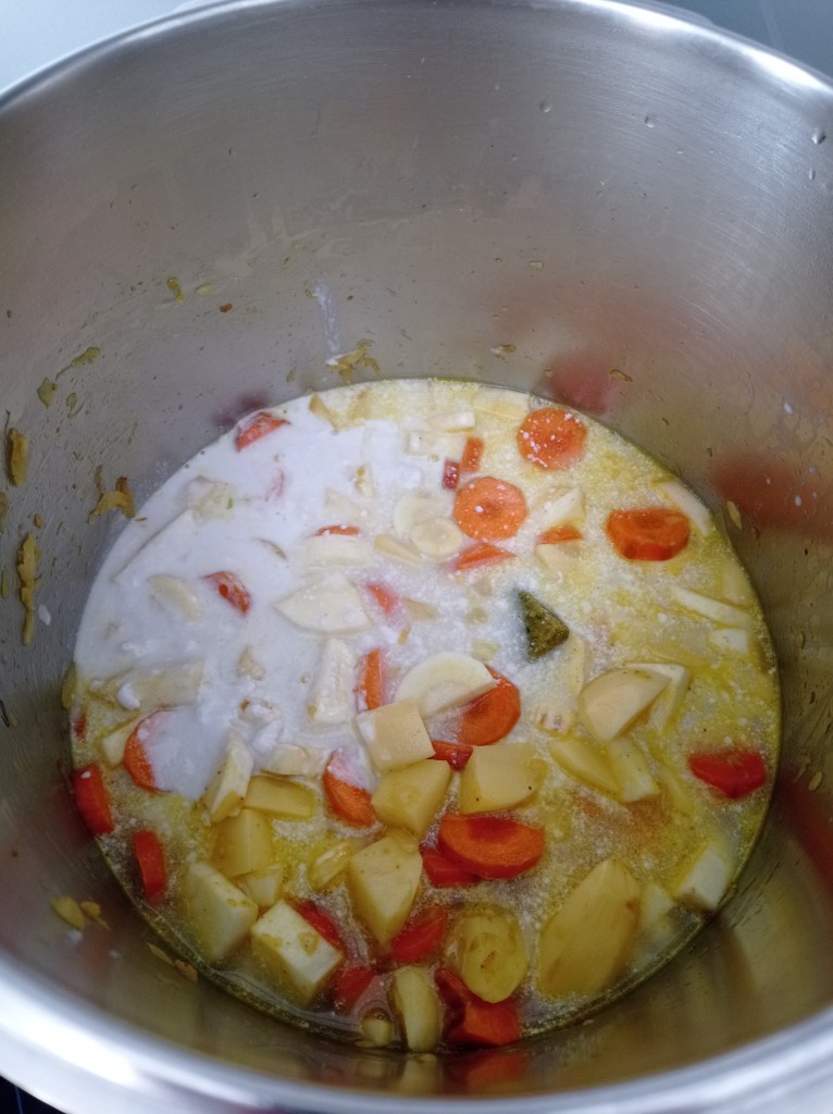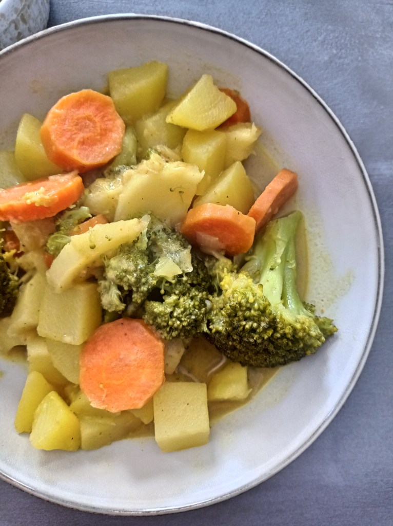 | Serve 4 1 yellow onion 3 carrots 2 parsnips 5 potatoes 1 broccoli 400 ml of coconut milk 500ml of vegetable broth 2 tsp curry powder 1 tsp sweet paprika 1 tsp turmeric 2 tbsp coconut oil salt and pepper | 1. Chop the onion and sauté in a pot with 2 tablespoons of coconut oil. 2. Add 1 tsp of curry powder and cook for 2 min to roast the curry. Meanwhile, cut the carrots into slices. 3. Add the carrots and cook for 3 min with a lid. 4. Add the potatoes and parsnips, previously cut into cubes. 5. Pour in the 500ml of vegetable stock. The vegetables should be almost covered with water. 6. Add the coconut milk. 7 and 8. Add all spices, salt and pepper to taste. Let cook for 10 min with a lid on medium/high heat. 9. Add the broccoli and let it cook for another 15 min with a lid, this allows the broccoli to cook with the steam. 10. You can serve it in a big bowl and accompany it with rice and/or lentils. |